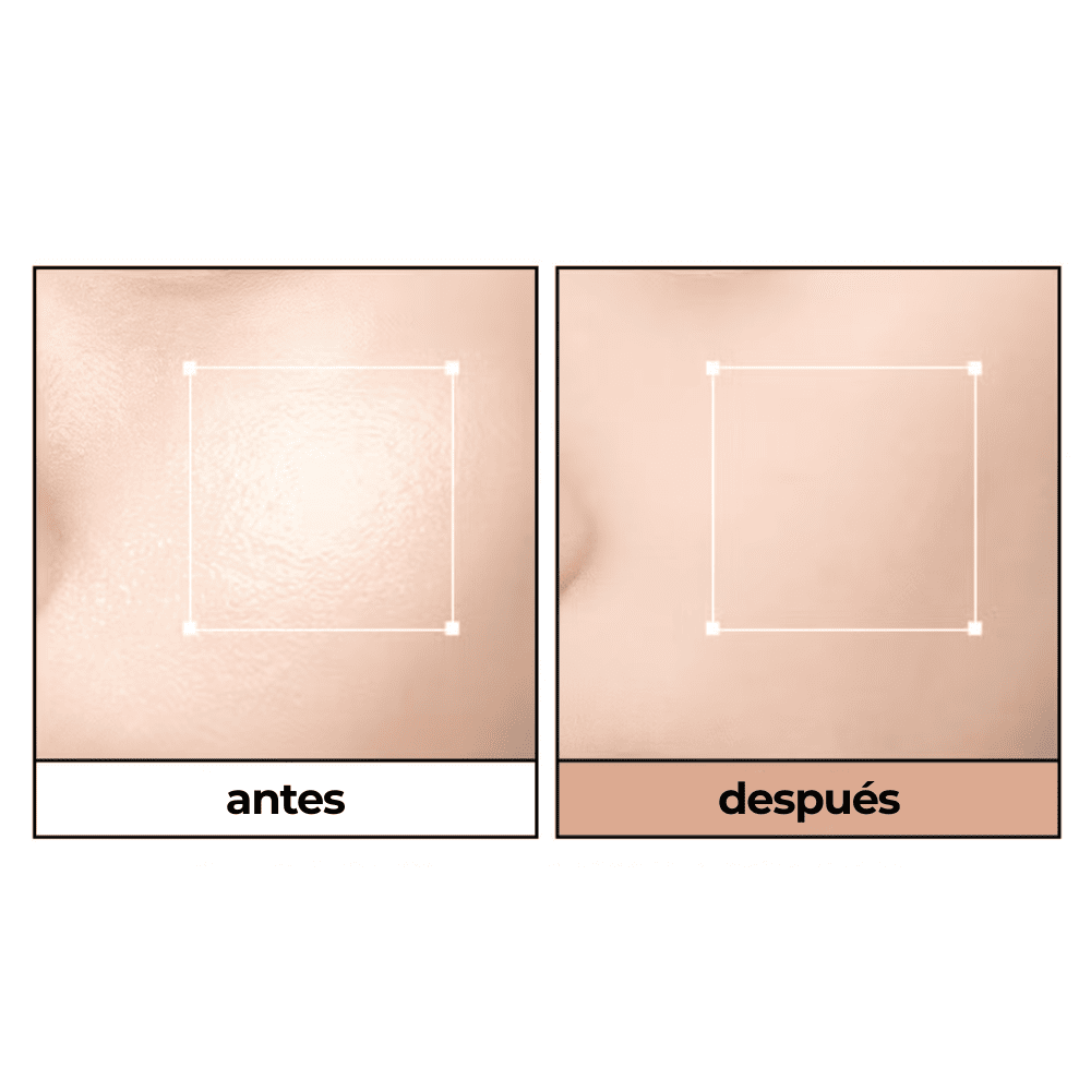 - Absorbe el exceso de grasa, regula la producción de sebo y difumina la apariencia de brotes y poros abiertos.